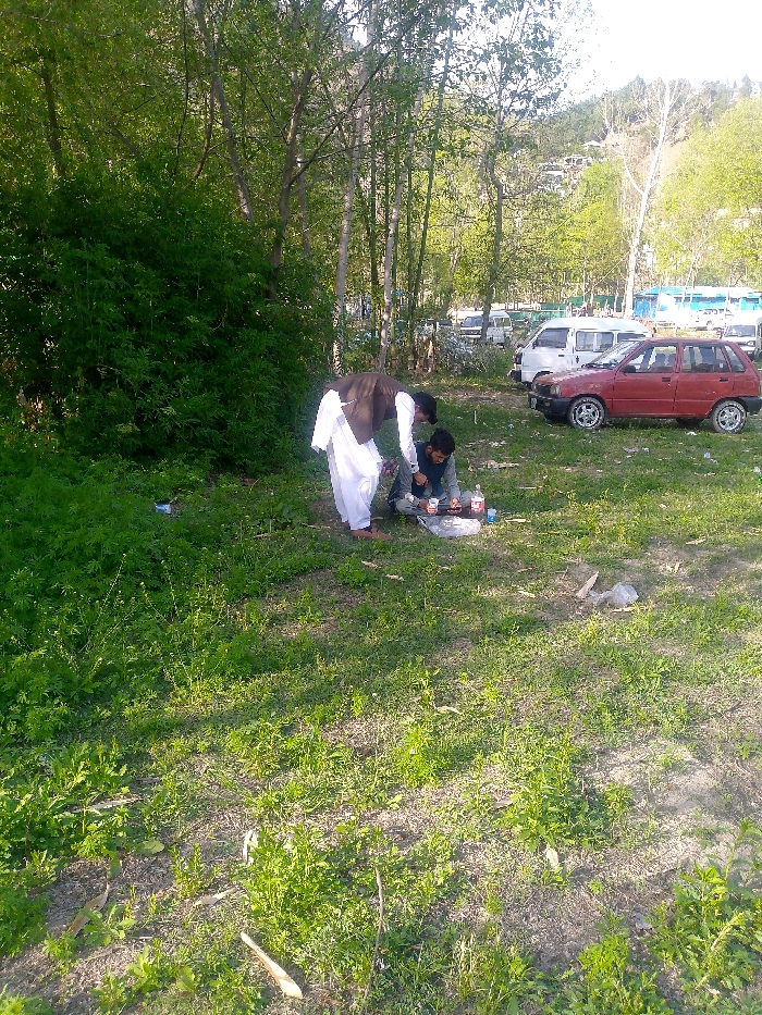 The image displays an outdoor scene in Dharyal, Pakistan, featuring two males interacting in a partially grassy, partially dirt-covered area. One male, dressed in a white salwar kameez and a brown waistcoat, stands and leans forward towards the ground. The second male is seated cross-legged on the ground, wearing a dark long-sleeved shirt and dark trousers. Both individuals are focused on objects laid out on the ground between them, which include a dark rectangular item, several small cups or bowls, and two plastic bottles (one red, one blue). Scattered litter, primarily white plastic debris, is visible on the ground. To the left, a dense green bush occupies the midground, while several trees with green foliage are present throughout the midground and background. Parked vehicles are visible in the background, including a red two-door hatchback, multiple white vans, and several blue buses. Beyond the vehicles, a distant hillside with scattered structures and sparse vegetation completes the scene under bright daylight.
