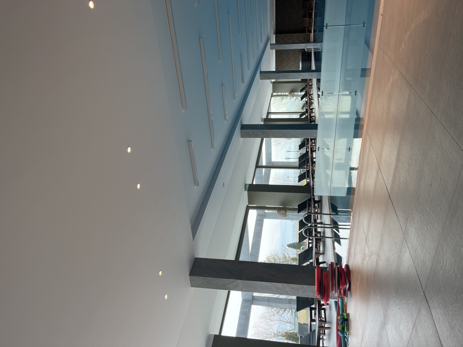 The image displays an unoccupied indoor swimming pool facility located in Ravno pole, Bulgaria. The large, rectangular pool contains clear blue water and features a set of metal steps on its left side. A clear glass barrier partially separates a section of the pool. The surrounding deck is surfaced with light brown, large square tiles. Along the left and far perimeters of the pool area, expansive floor-to-ceiling windows offer a view of an outdoor environment consisting of bare trees and grassy ground under an overcast sky. Numerous unoccupied dark-colored lounge chairs with wooden frames are arranged along these windows. The interior space is supported by multiple large, square pillars clad in dark gray stone. The ceiling is predominantly white, incorporating recessed spotlights. A section of the ceiling directly above the main pool is painted light blue and fitted with several linear surface-mounted fluorescent light fixtures. On the tiled deck, to the left of the pool, a stack of approximately 15-20 red rectangular kickboards is present, alongside several green and yellow foam swim noodles. A single woven pendant lamp hangs near one of the central pillars. On the far right, a wall with a dark, textured finish is visible, and a square spa pool or hot tub is partially discernible within the water. No individuals are present in the scene.