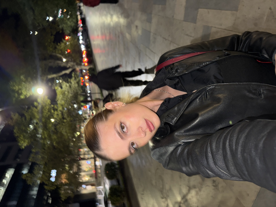 A young adult female is centered in a night-time selfie taken on a pedestrian walkway