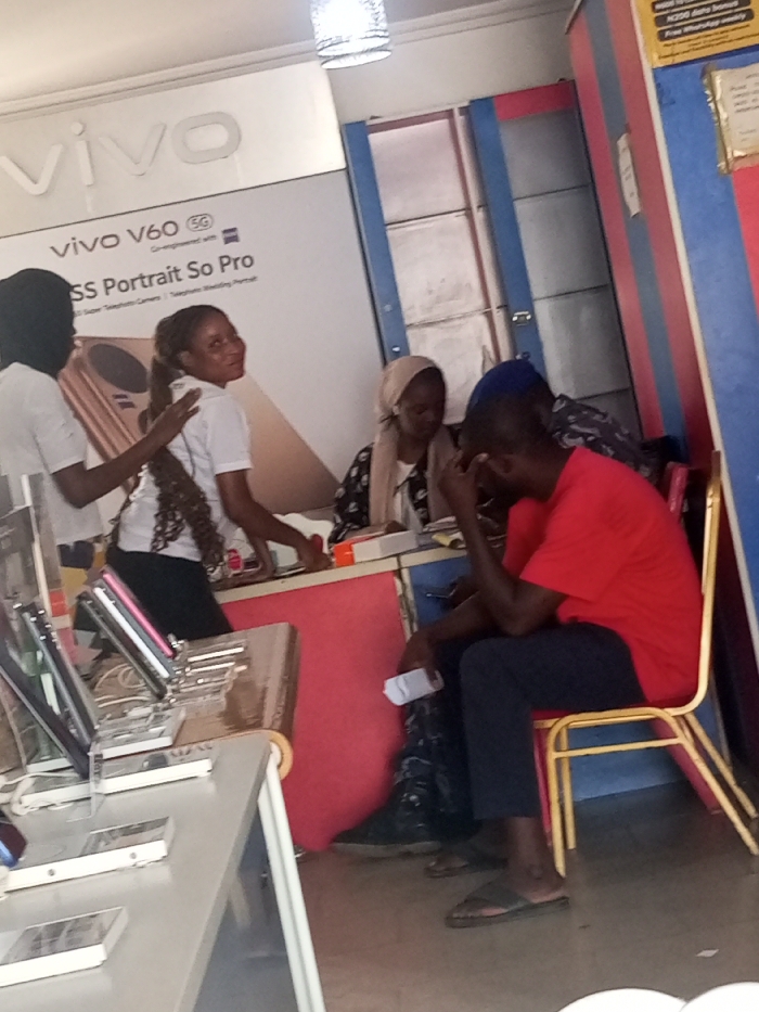 This image captures an indoor scene within a commercial establishment, specifically identified as being in Lokoja, Nigeria. The setting appears to be a mobile phone store or service center. On the left, a prominent white wall displays a "vivo V60 5G" advertisement, featuring text such as "Co-engineered with ZEISS Portrait So Pro" and an image of a gold-colored smartphone. Below this advertisement, a light-colored counter or display table holds multiple mobile phones or display cases within clear acrylic stands. Four individuals are distinctly visible, with a fifth partially obscured. From left to right: 1. A person wearing a dark head covering and a white top, with their back mostly to the camera. Their right hand is placed on the left shoulder of the adjacent individual. 2. A female with long, dark braided hair, wearing a white short-sleeved top and dark bottoms. She is positioned behind a red counter, looking towards the camera with a smile. 3. A female wearing a light-colored head covering and a dark patterned top, seated behind the red counter. She is looking down at objects on the counter, which include several small boxes. 4. A male wearing a red short-sleeved t-shirt and dark trousers, seated on a gold-framed chair with a red cushion. He has a dark blue cap on his head. His right hand is resting on his forehead or temple. In his left hand, he holds a small white rectangular object. His left leg is covered in a dark, possibly protective wrapping, while his right foot, partially visible, wears a sandal. 5. Partially visible behind the seated male is another individual wearing a dark top, possibly a uniform, and a dark blue cap. The background on the right side of the image features a wall with alternating vertical red and blue stripes. A yellow sign with black text, advertising services such as "N200 Data bonus" and "Free Whatsapp weekly," is affixed to this wall. A decorative light fixture hangs from the ceiling. The floor appears to be a light-colored, uniform surface. The overall scene depicts a customer service or sales interaction in progress.