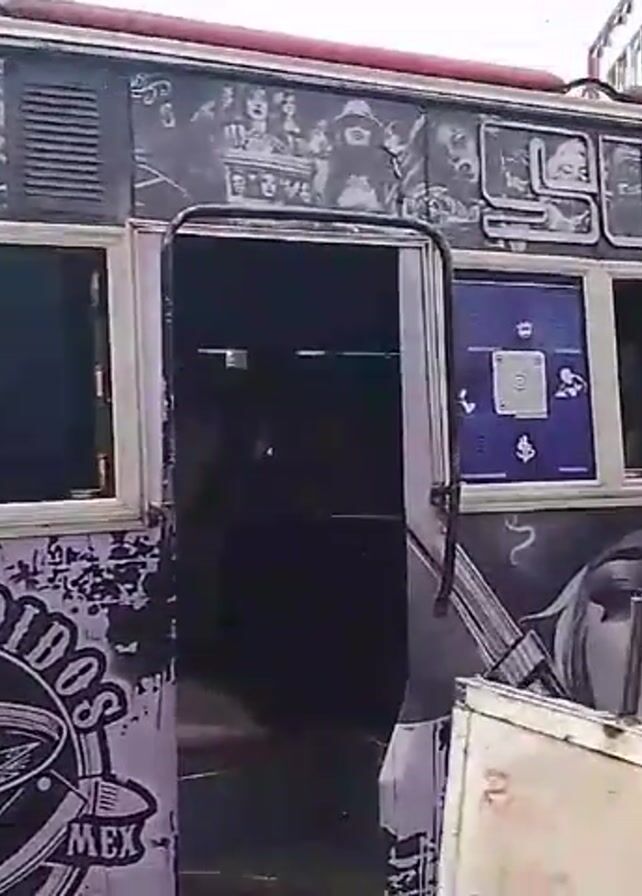 busy street scene with several colorfully decorated minibuses, or matatus, in what appears to be an urban area. People are gathered around the vehicles. The buses are adorned with various murals and designs. One bus has a “Los Bandidos” theme, with a Playboy bunny logo. Another bus is marked with “Congratulations” on its exterior. People are standing and moving around the buses. Buildings are visible in the background, indicating an urban setting.