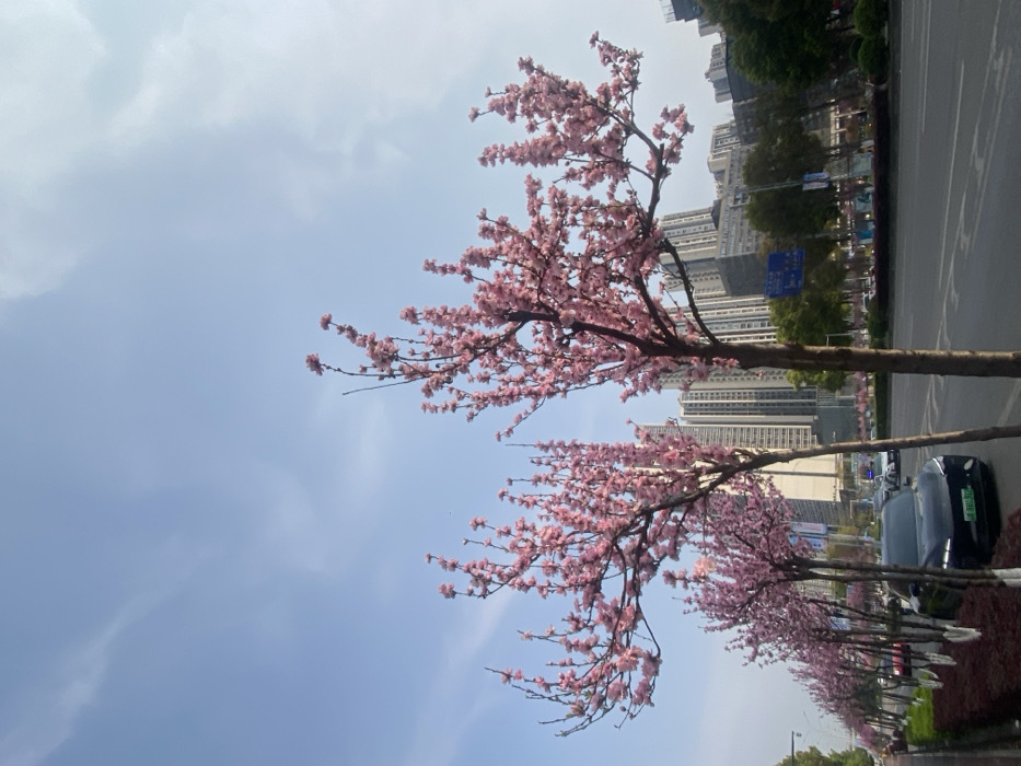 The image presents an urban street scene located in Chongqing High-tech Zone, China, on a clear day with a light blue sky and scattered faint white clouds. A prominent row of deciduous trees, laden with dense pink blossoms, lines the left side of a multi-lane asphalt road, extending into the background. A dark-colored sedan, possibly black or dark blue, with a visible green license plate (indicating a new energy vehicle), is parked or stationary alongside the trees on the left. Further down the road, other vehicles are visible, including one in the far distance with what appears to be flashing white and blue lights. The road features a concrete median strip with low green shrubbery and distant streetlights. In the background, numerous modern high-rise buildings of various designs and heights constitute the urban skyline. A blue road sign with white Chinese characters is visible on the right side of the road, beneath the distant buildings. No individuals are discernible within the frame.