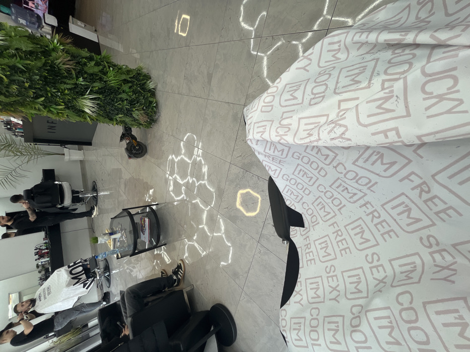 This image captures the interior of a modern barbershop or hair salon in Plovdiv, Bulgaria, from the perspective of a client seated in a barber chair. The foreground shows a white barber cape patterned with repeating phrases like "I'M COOL," "I'M FREE," "I'M GOOD," "I'M LUCKY," and "I'M SEXY," with scattered hair trimmings on its surface. The salon features light grey tiled flooring with several hexagonal light reflections. In the middle ground, two male barbers with dark hair and beards, wearing black t-shirts, are actively cutting the hair of two male clients. The client on the left wears a white cape with partial text "MOR" visible, while the client on the right wears a plain black cape. Behind each client is a barber station with a large mirror and shelves stocked with various hair products. To the left, a person is seated in a black armless chair, visible from the torso down, wearing dark trousers and black Adidas sneakers with white stripes. Adjacent to them is a black two-tier coffee table holding a plastic water bottle, a mobile phone, and other small items. On the right side of the room, a tall, floor-to-ceiling column is entirely covered in artificial green foliage. A black electric scooter is parked at the base of this green column. In the background, a dark reception counter with "INF" partially visible indicates a reception or product display area. The overall environment appears clean, well-lit, and professionally maintained.