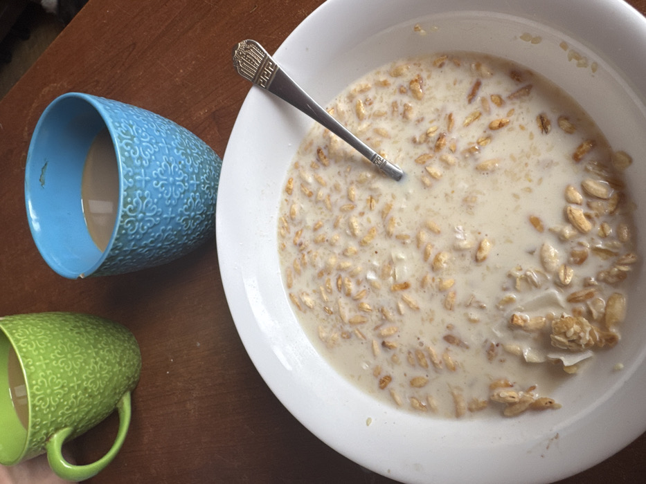 The image displays a breakfast setting on a brown wooden surface in Makiivka, Ukraine. In the foreground, a white ceramic bowl holds puffed cereal soaked in milk, with a silver spoon resting within the mixture. The spoon handle features a decorative geometric pattern and a crest-like design. To the upper left, a green textured ceramic mug with a handle contains a dark beverage, likely coffee or tea with milk. To the upper right, a blue textured ceramic mug, also containing a dark beverage, exhibits a chip on its rim. The items are stationary, suggesting preparation for or active consumption of a meal.
