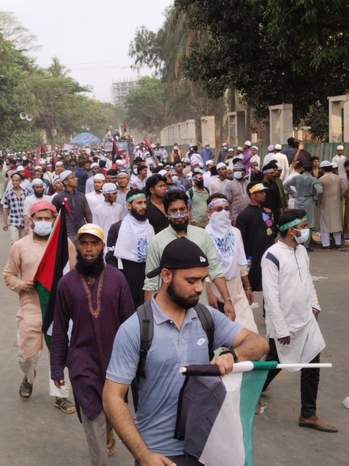 A large group of men, mostly young, are walking down a street in Dhaka, Bangladesh, at coordinates 23