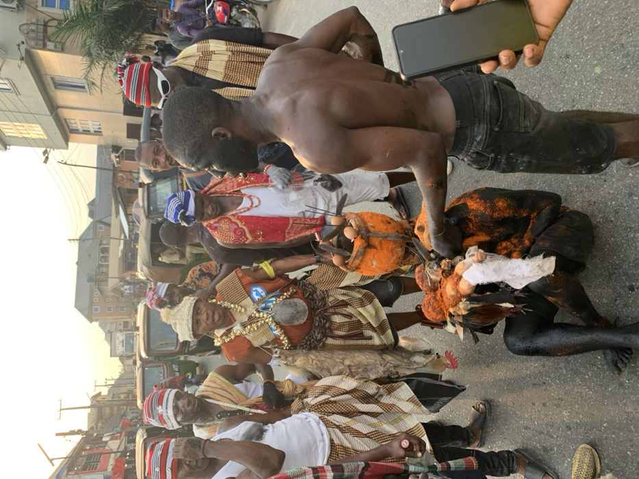 A street scene presents a group of people in traditional attire, including patterned robes and headwear. One man kneels on the ground, his body painted with orange powder. Another man, shirtless and wearing black jeans, looks down at him. A mobile phone is held in the upper right corner. The scene includes symbolic items such as eggs in a basket and a chicken. The setting seems to be an urban area with buildings and vehicles visible in the background.