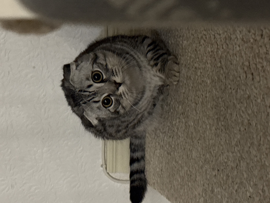 - "A domestic Scottish Fold cat with silver tabby mackerel markings, amber eyes, and dilated pupils is observed in a crouched, alert posture on a light beige textured carpet" by FM-xlahD2, licensed under CC BY 4.0