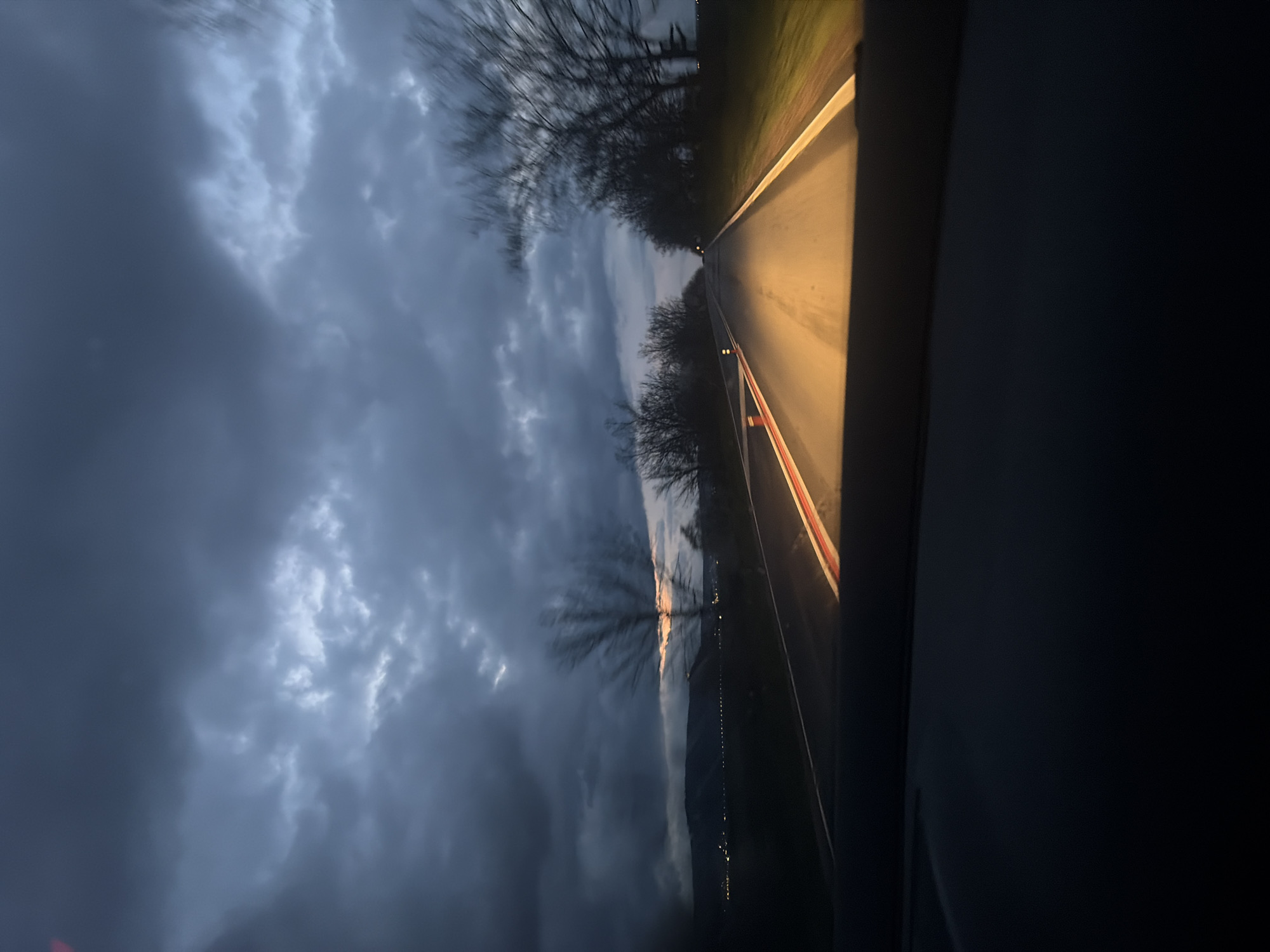 A road is shown from the perspective of someone inside a vehicle. The road stretches forward, illuminated by the vehicle's headlights. On either side of the road, there are trees, some of which are bare-branched. The sky above is filled with dark, ominous clouds. A strip of lighter sky or a hint of sunset is visible on the horizon, between the trees and the clouds. On the side of the road, a red safety barrier or marker is visible. The location cannot be confirmed to be Dibich, Bulgaria from the image provided.