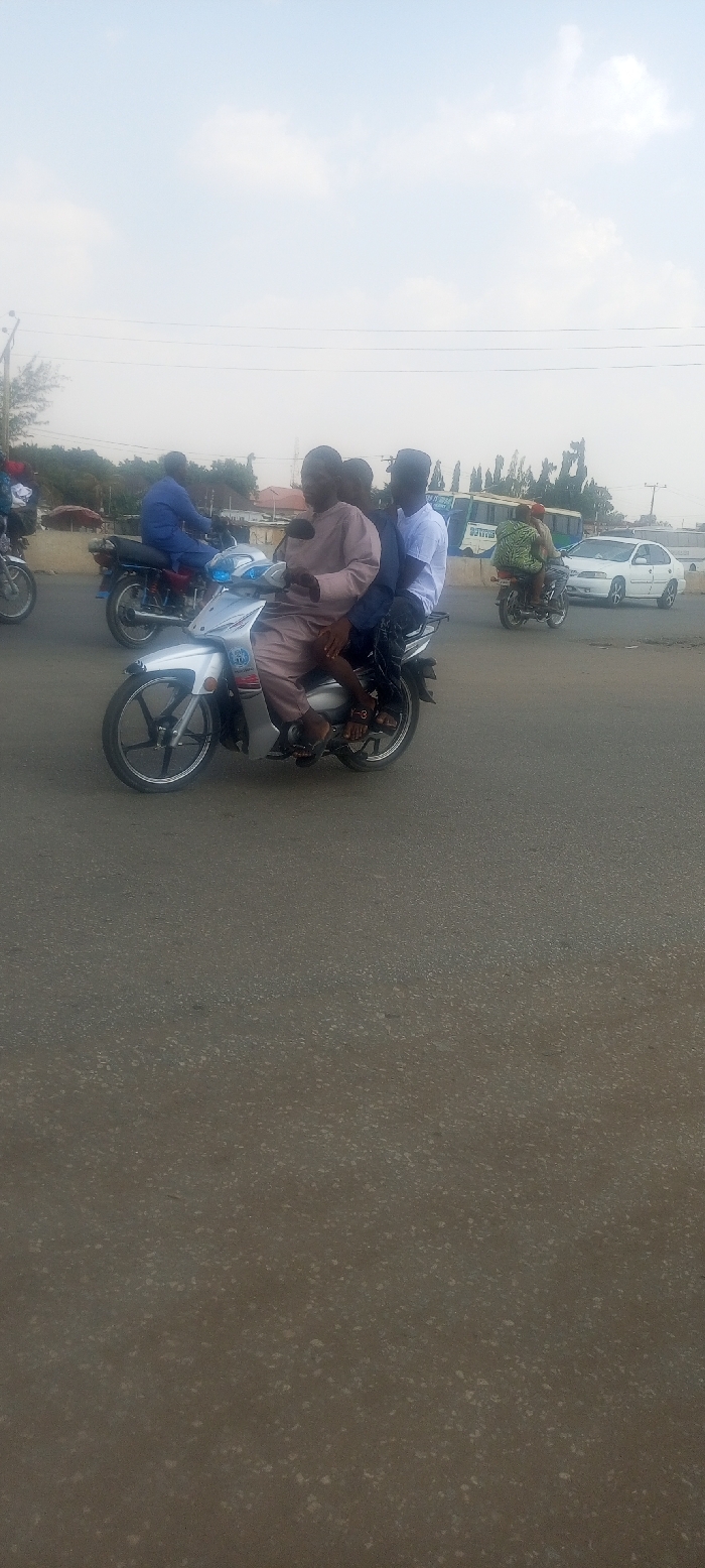 The scene depicts a street in Gwagwalada, Nigeria, under a hazy, light-colored sky with scattered clouds. The foreground consists of an asphalt road surface. The central subject is a silver-colored motorcycle, positioned slightly to the left of the frame's center, moving from left to right. Three male individuals are riding the motorcycle. The driver wears a light brown/tan long garment and dark sandals, operating the handlebars. A second male, appearing younger, sits directly behind the driver, wearing a dark blue long-sleeved top and dark pants. A third male sits behind the second, wearing a white t-shirt and dark pants. The motorcycle has black, multi-spoke wheels and a blue light on its front fairing. In the mid-ground, to the left of the central motorcycle, another motorcycle is partially visible with a rider in blue. Further back, a red motorcycle is visible with a driver also in a blue top. To the right, another motorcycle carries two individuals, with the driver wearing a distinct green, yellow, and black patterned shirt. Behind these motorcycles, a white sedan is visible, and further back, large blue and white buses are present, suggesting a public transport route or terminal. The background shows green vegetation, trees, and utility poles with overhead power lines. The overall lighting suggests daylight conditions, possibly late morning or early afternoon, with atmospheric haze.