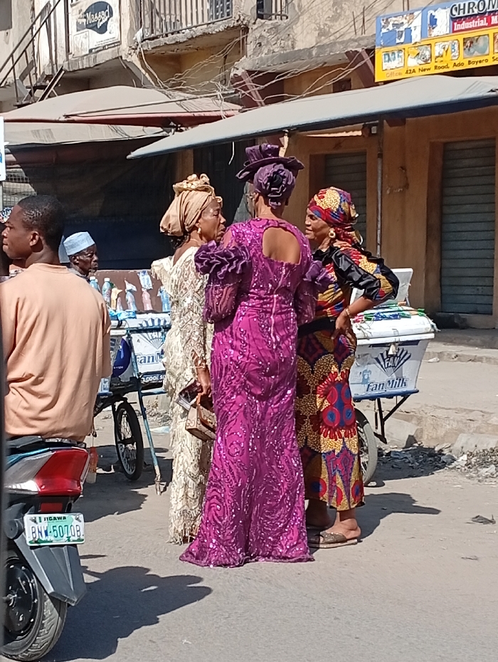 Three women stand conversing, adorned in traditional African attire, including head wraps and ornate gowns. One wears a magenta dress with glittering embellishments, another a gold dress, and the third a patterned outfit. They are situated on a street with vending carts nearby. In the foreground, a person and a motorcycle are visible. Buildings with awnings and commercial signage line the backdrop. The environment suggests a bustling urban setting.