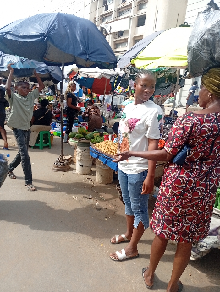 The image depicts a street market scene in Onitsha, Nigeria, under bright daylight