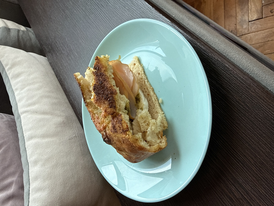 A partially consumed sandwich rests on a light turquoise ceramic plate, centered on a dark brown, textured table surface. The sandwich is constructed from a piece of focaccia-style bread, featuring a golden-brown crust, and is filled with layers of light pink sliced deli meat (likely turkey or ham), a slice of white mozzarella or similar soft cheese, and a green pesto spread. A visible bite has been taken from one end of the sandwich. In the background, behind the table, a light beige cushion with a light grey trim is visible, with a secondary purple-grey cushion partially obscured further back. To the lower right, a segment of a wooden floor with a herringbone parquet pattern is present. No individuals or active interactions are visible in the scene. The location is an indoor setting in Kazanlak, Bulgaria.