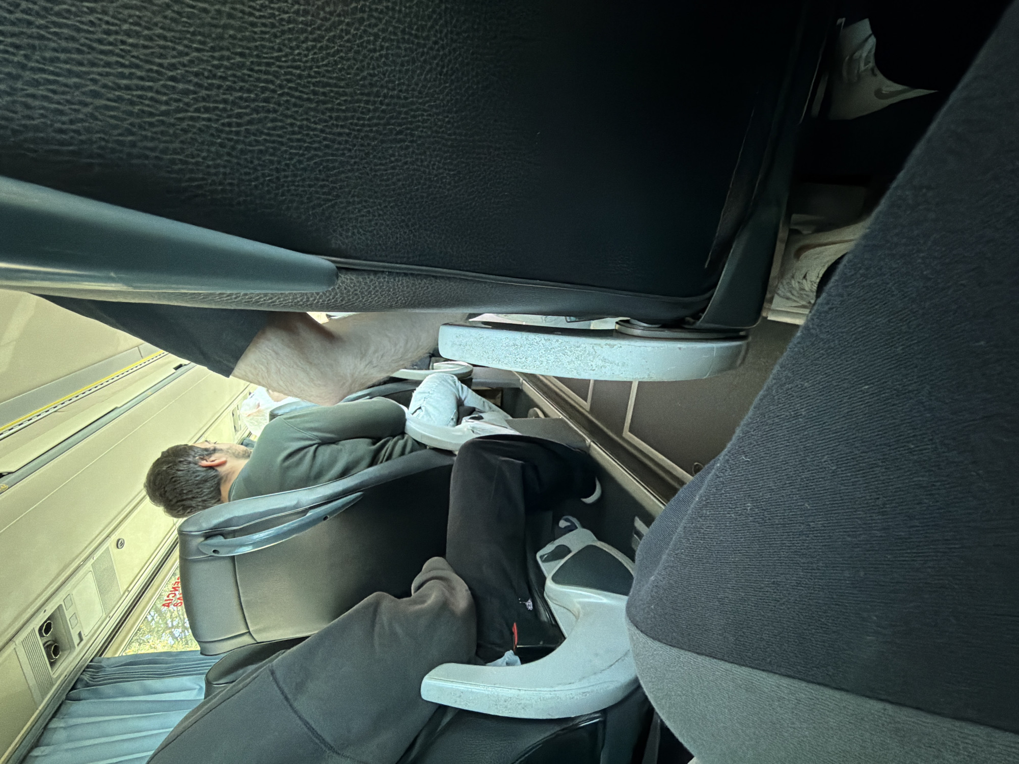 The image displays the interior of a public transport coach or bus, observed from a seated passenger's perspective, located in Matosinhos, Portugal. In the foreground, the lower body of the person capturing the image is visible, wearing dark grey pants with a lighter grey section on the left. White sneakers are discernible on the floor below the seat ahead. Immediately ahead and to the left, a passenger is seated, clad in a dark grey hooded sweatshirt and black pants, with their feet resting on a white plastic footrest attached to the seat in front. Centrally positioned, the back of a male passenger is visible, wearing a dark green long-sleeved shirt. He has short, dark brown hair. His lower body is partially visible, showing light-colored pants and white sneakers. To the right of the frame, the bare forearm and lower arm of another passenger are visible, resting on the seatback directly ahead of the observer. The vehicle's interior features dark grey, textured seats with light grey plastic frames and handles. The ceiling is light-colored, equipped with vents and overhead lighting. A window on the left side, partially covered by light blue curtains, reveals bright daylight and green foliage outside. A reversed red reflection of the Portuguese word "EMERGÊNCIA" (Emergency) is present on the window pane. The floor is dark with subtle patterned stripes. All visible individuals are seated.