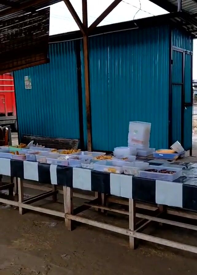 Under a corrugated metal roof supported by wooden beams, a roadside food stall is in operation