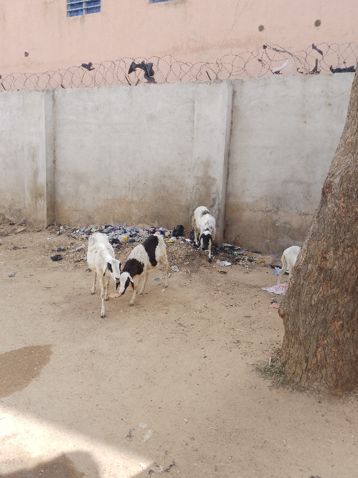 The scene depicts an outdoor environment in Dabawa, Nigeria. Four sheep are present on a dirt ground surface. Two sheep, one predominantly white and one white with black markings, are positioned centrally, appearing to interact head-to-head. A third sheep, white with black markings on its face and neck, is foraging in a refuse pile located against a concrete wall on the right side of the frame. A fourth, mostly white sheep is partially visible behind the tree trunk on the far right, also near the refuse. The refuse pile consists of various discarded materials, including plastic bags and fabric. The concrete wall forms the background, topped with coiled barbed wire. Behind this wall, a peach-colored building is visible, featuring two rectangular, blue-tinted windows in the upper section. Several dark items, possibly plastic bags or debris, are caught on the barbed wire. A large tree trunk occupies the right foreground.