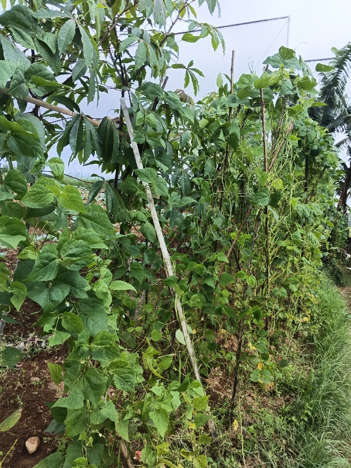This image depicts a cultivated agricultural plot in Kutkai, Myanmar, under an overcast sky. The scene is dominated by dense green vegetation, primarily climbing plants supported by vertical stakes. In the foreground and midground, a variety of plants are visible. To the left, robust climbing plants with broad, ovate green leaves are present, some displaying small white flowers. Interspersed among these are taller plants with distinctive palmate, multi-lobed leaves, likely a species such as cassava. Multiple vertical wooden or bamboo poles serve as support structures for the climbing vegetation. Towards the right side of the frame, another section of climbing plants exhibits numerous thin, elongated green pods, indicative of long beans or yardlong beans, clinging to their stakes. The ground beneath the plants consists of dark brown, cultivated soil, with some small stones and organic debris visible. In the background, a light grey, uniformly overcast sky is visible above the plant canopy. Partially obscured by foliage, two sections of white, mesh-like netting are visible against the sky, suggesting an enclosure or protective structure. To the far right, a portion of a larger plant with broad leaves, possibly a banana tree, is partially discernible. A strip of uncultivated green grass and weeds borders the far right edge of the cultivated area. No individuals are present in the frame. The lighting is diffused, consistent with an overcast condition.