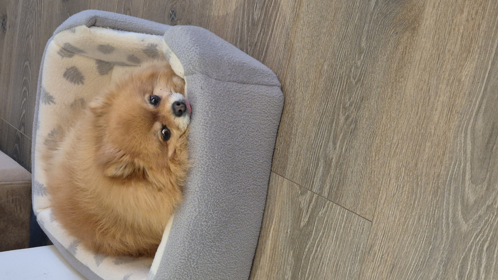 - "A small, light-brown Pomeranian dog rests in a grey and white dog bed on a wooden floor" by FM-YiPfA3, licensed under CC BY 4.0