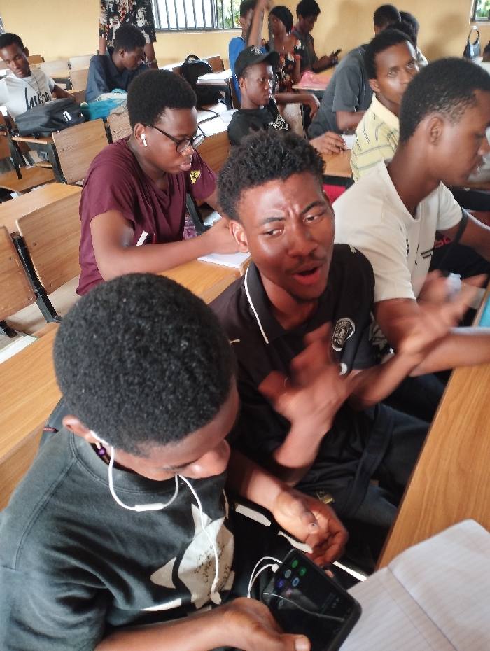 Classroom setting with diverse students seated at desks. Several individuals are visible: One wears glasses and listens with earphones, another is focused on a mobile phone with connected earphones, while a third appears to be speaking animatedly with hands raised. Other students are seen in the background, some engaged with phones or writing in notebooks, creating a busy academic environment.