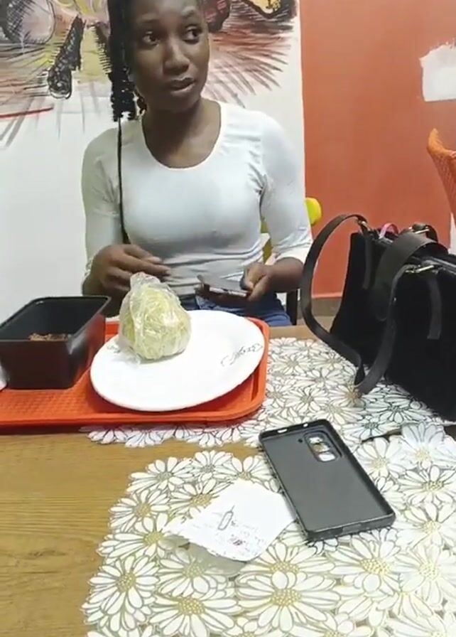 A young woman with braided hair sits at a table, unwrapping food from plastic wrap with her hands. The food sits on a white plate, which is placed on an orange tray next to a rectangular black container. There is a black purse and a black phone case on the table, which is covered with a white floral tablecloth. A piece of paper with writing on it is also on the table. The background features a painting of people cooking over a fire and a wall painted with orange and beige colors.