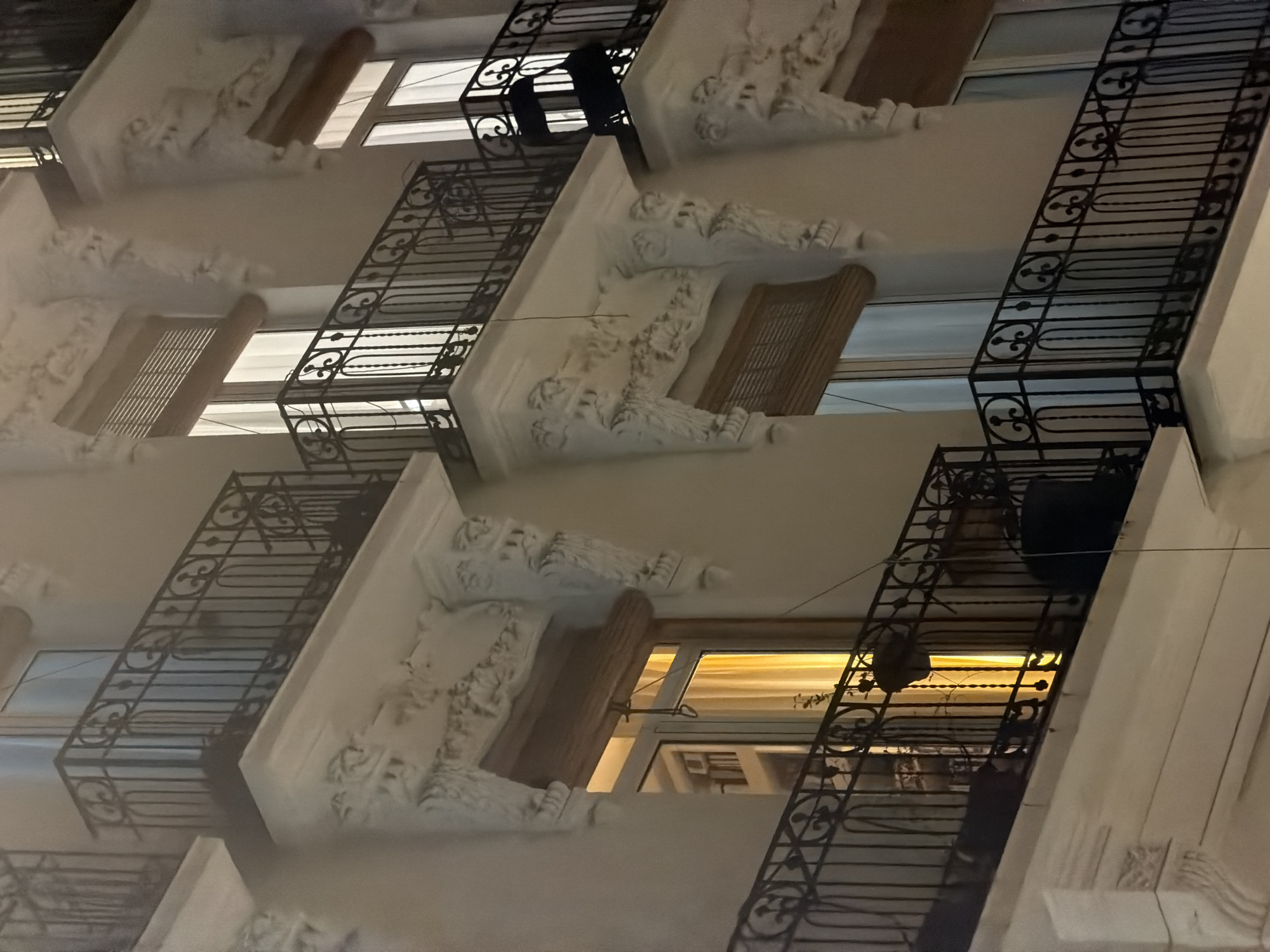 The image displays a detailed view of a multi-story building facade at night in València, Spain. The building features a light-toned exterior, likely painted stucco, with ornate architectural detailing. Multiple balconies, each supported by decorative white stucco or carved stone brackets featuring scrollwork and sculptural elements, are visible. These brackets are positioned below and between windows. Each balcony is fitted with a black wrought iron railing, incorporating decorative patterns of scrolls and vertical bars. The windows are tall and rectangular, some displaying a warm yellow interior light, while others show a cooler, whiter illumination. Upper windows reveal internal blinds, appearing as slatted wooden or bamboo structures. On a lower-left balcony, a dark, indistinct object, possibly a bag or cover, is present along with a potted plant exhibiting sparse foliage. A thin, dark wire or cord descends vertically from above, passing near this balcony. On a middle-right balcony, a dark, angled object, possibly a chair or a large bag, is observed draped over the railing. No individuals are visible.
