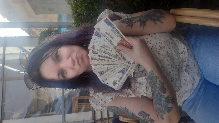- "A woman is depicted seated outdoors in Al Ahia', Egypt, holding a fanned stack of approximately ten to fifteen 200 Egyptian Pound banknotes in her left hand, presenting them towards the camera" by FM-rbNr72, licensed under CC BY 4.0