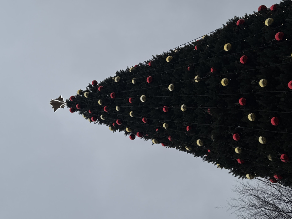 A large, conical artificial Christmas tree, dark green in color, dominates the scene, viewed from a low-angle perspective looking upwards. The tree is extensively decorated with numerous spherical ornaments in alternating red and gold colors, distributed vertically along its branches. Fine strings of small, unlit white lights are visible running vertically between the ornaments. A prominent, illuminated five-pointed star, appearing golden or light-colored, crowns the very top of the tree. The sky is uniformly overcast and light gray, occupying the upper portion of the frame. In the lower-left corner, a small section of a bare, deciduous tree with thin, dark branches is visible. No people or specific actions are depicted. The scene is located in the city of Bila Tserkva, Ukraine.