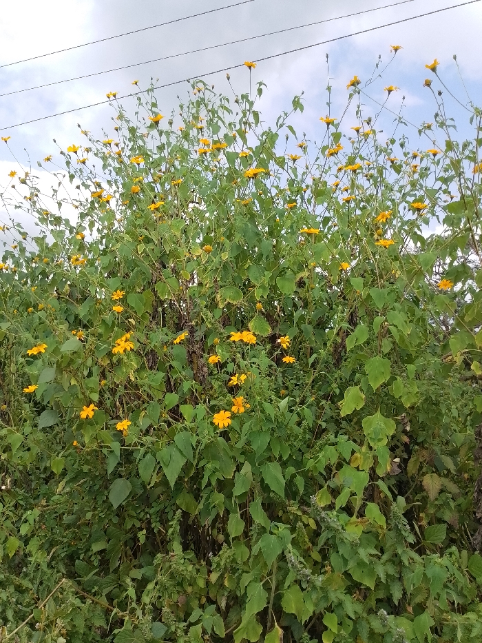 - "The image displays a dense growth of Tithonia diversifolia (Mexican sunflower) plants, characterized by numerous vibrant yellow flowers and abundant green foliage, dominating the foreground and midground" by FM-TKrYD3, licensed under CC BY 4.0