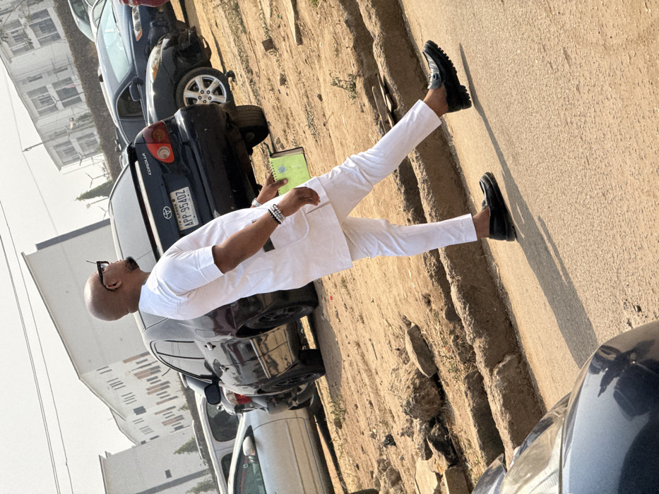 In Galadimawa, Nigeria, an adult male, bald and wearing dark-framed sunglasses, is captured in mid-stride on an unpaved shoulder next to a paved road. He is dressed in a white short-sleeved tunic with a subtle textured pattern and matching white trousers, accessorized with black chunky loafers and multiple beaded bracelets on his left wrist. He holds a bright green notebook or pad in his left hand. The ground transitions from a light brown, uneven dirt surface to a darker paved road, separated by a low, rough concrete barrier. Strong sunlight casts distinct shadows to the lower right. Behind the man, a row of parked vehicles is visible, including a dark-colored Toyota Corolla sedan with Nigerian license plate APP 954DZ. In the background, several multi-story buildings with light-colored facades are present under a bright, hazy sky. No other individuals are clearly visible.