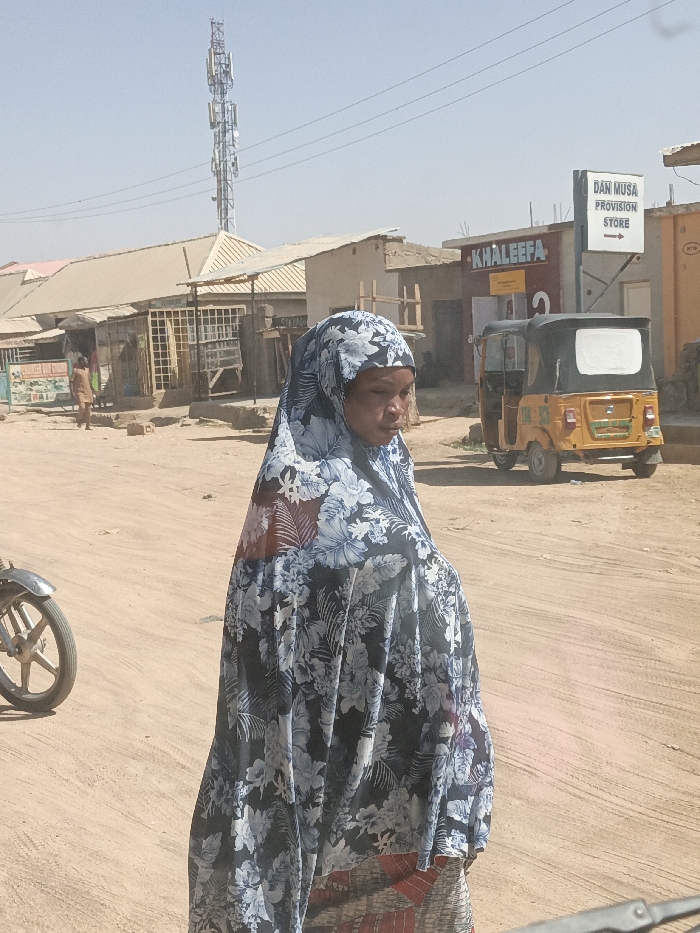 A daytime scene in Hotoro South, Nigeria, depicts an unpaved, dusty street lined with single-story buildings under a clear sky. In the foreground, a woman with dark skin stands slightly right of center, looking downwards. She wears a dark blue full-body covering patterned with white and light blue flowers. To her immediate left, the front wheel and handlebars of a motorcycle are partially visible. In the mid-ground, a yellow three-wheeled auto-rickshaw with a black roof is parked on the right, facing away from the camera. A building behind the auto-rickshaw displays a sign reading "DAN MUSA PROVISION STORE" with an arrow, and another sign below it states "KHALEEFA." Further down the street on the left, a male figure in light clothing walks. The background features more buildings, some with corrugated metal roofs, and a tall, multi-tiered telecommunication mast rises prominently under visible overhead power lines.