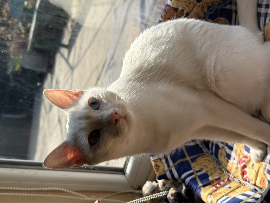 - "A white domestic cat with heterochromia, exhibiting one dark eye and one light blue eye, is depicted sitting upright in a patterned pet bed near a window" by FM-Yeet12, licensed under CC BY 4.0