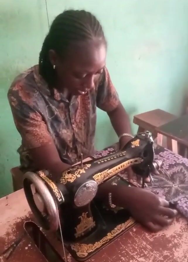 A woman is sitting at a sewing machine. She has dark skin and her hair is braided. She is wearing a short-sleeved button-down shirt with a brown, black, and grey print. The sewing machine is old-fashioned, black with gold decorative accents. She is using the machine to sew a piece of purple patterned fabric. The sewing machine is on a worn wooden table. The wall behind her is light green. A light switch and what appears to be a small wooden stool are also visible.