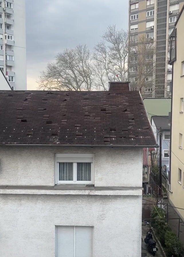 medium shot of a two-story house with a brown, tiled roof. The roof is damaged, with numerous tiles missing. The house is painted white and has two windows with white frames and closed white shutters. An air conditioning unit is visible on the side of the house. Tall apartment buildings can be seen in the background. A narrow alleyway is visible to the right of the house with a motorcycle parked along with other objects. The sky is overcast. The video appears to have been shot from an elevated position, possibly from another building. The wind noise is clearly audible throughout the video.
