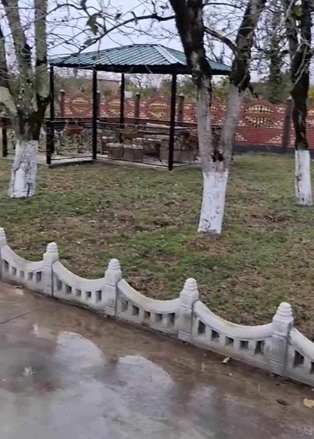 wet courtyard scene, likely after rainfall. A single-story house with a wooden door faces the camera. To the left is a two-story building with an external staircase. In the yard, there's a gazebo with a picnic table, trees with whitewashed trunks, and a decorative concrete fence lining the walkway. A flock of white ducks is visible near one of the buildings. The ground is wet and reflective. The sky is overcast.