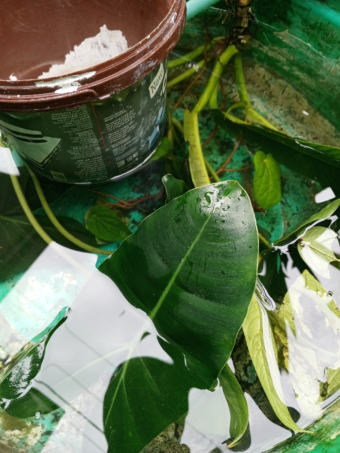 The scene is located in Phoukhoun, Laos. The image presents an overhead view of a green plastic basin containing clear water. Submerged and partially submerged within the water are various botanical elements, including several broad, dark green leaves, some exhibiting water droplets on their surface, along with lighter green vine-like stems and darker, fibrous root structures visible near the basin's bottom. Positioned to the upper-left, partially submerged, is an open-top, brown plastic container, consistent with a discarded paint or chemical can, bearing dried white residue along its rim. Incomplete white text, including the word "New," is discernible on its dark green label. The interior bottom of the green basin shows areas of dark discoloration.