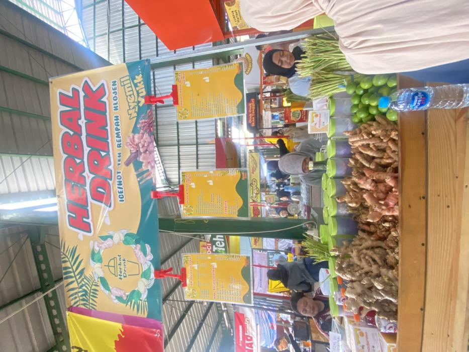 A brightly colored "Herbal Drink" stand displays its menu and ingredients