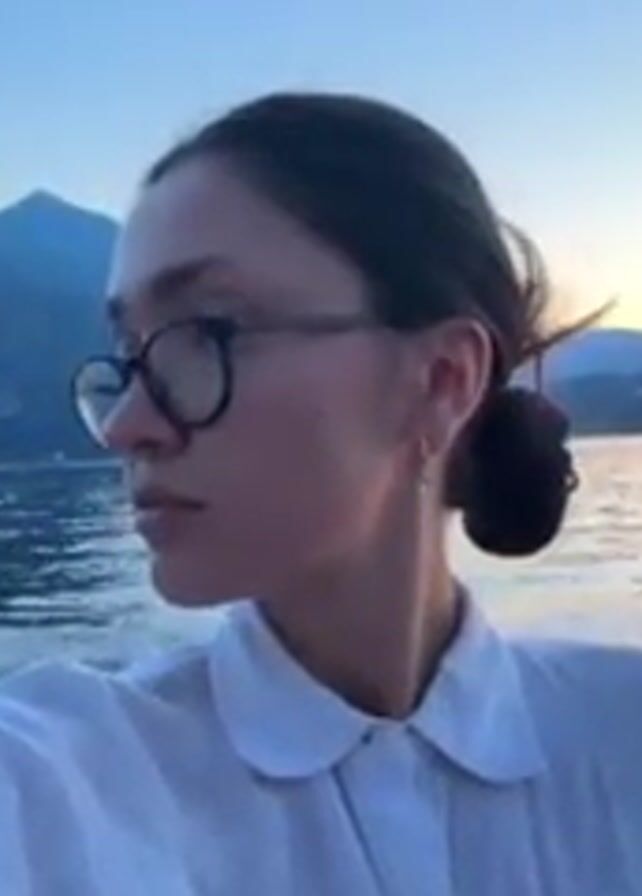 young woman with brown hair pulled into a bun, wearing a white collared shirt and round glasses. She is on a boat on a lake or body of water with mountains in the background. The light suggests it is dusk or early evening. The woman looks at the camera and briefly sticks her tongue out. The camera moves closer to her face. The boat is moving, as evidenced by the ripples in the water.