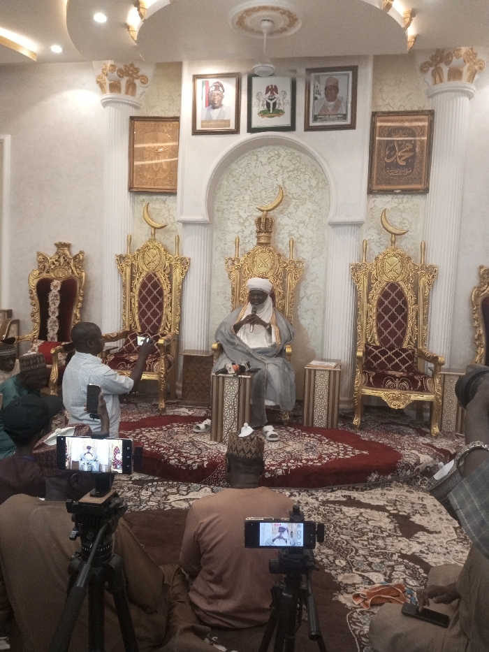 Inside a lavishly decorated room, a seated man in traditional robes addresses an audience. His ornate throne is flanked by similar chairs and crescent moon symbols. Pictures adorn the wall above. The audience, seated on the floor, record the event on their phones mounted on tripods. A red, patterned rug covers the floor. The scene exudes formality and cultural significance.