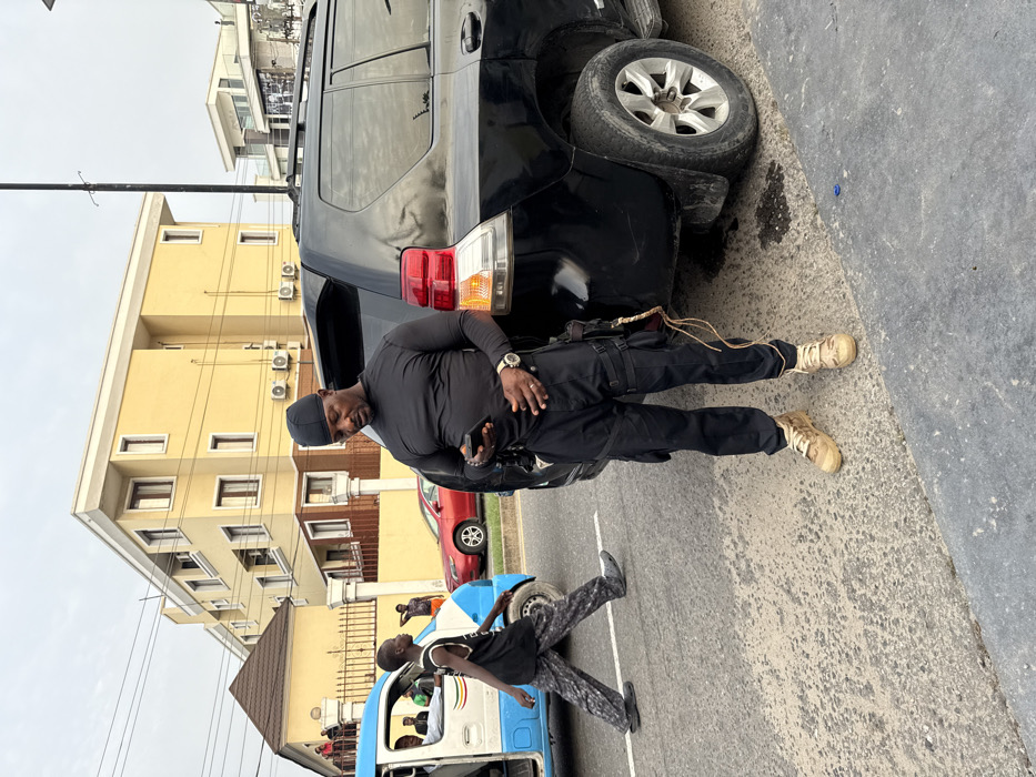 A man in all-black attire, including a cap and military boots, stands next to the rear of a black SUV. He appears to be holding a mobile phone. He is wearing a watch and a belt equipped with pouches. A blue and white vehicle with passengers is visible in the lower left corner, along with other people and cars in the background. A multi-story yellow building is on the left side.
