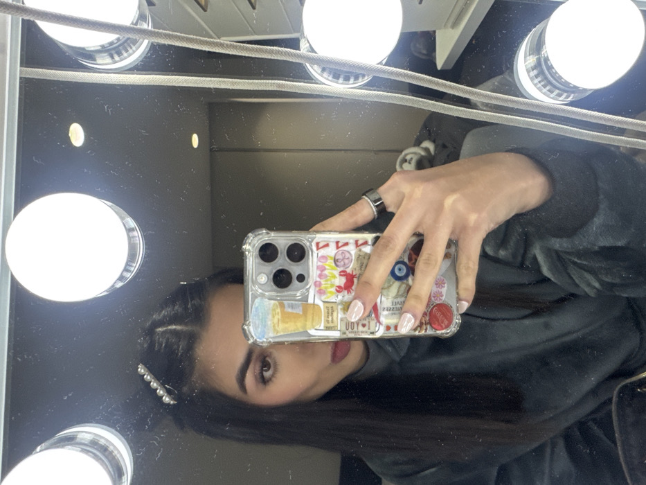 A woman's reflection in a mirror lined with bright, round lights. She is holding up a phone with a clear case adorned with stickers. A black ring is visible on her hand. The reflection shows half of her face, including one eye and part of her mouth. She has a pearl hair clip. The reflection captures the dark-colored top she is wearing.