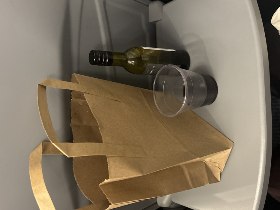 The scene displays an arrangement of objects on a light grey folding tray table, typical of a transport setting, located in Stoke-on-Trent, United Kingdom. A brown paper bag with two integrated handles occupies the left foreground, standing upright. To its right, a small, dark green glass bottle with a black screw cap is positioned, its contents partially depleted. Directly beside the bottle, a clear plastic cup holds a quantity of dark red liquid. The background is a uniformly plain, light grey interior panel. No individuals are depicted.