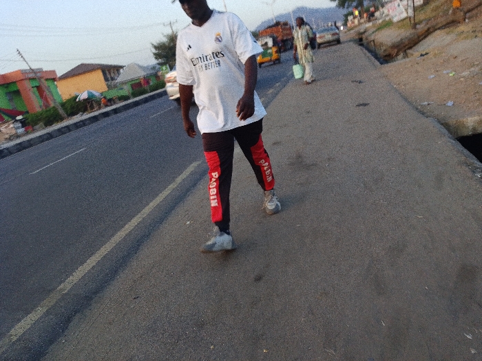 A person in a white Real Madrid shirt and "ROBIN" branded pants walks on a paved area alongside a road. Another person in a light-colored robe carries a white bucket in the background. Vehicles are visible in the distance. Buildings and trees line the opposite side of the road. The pavement is gray and appears slightly uneven.