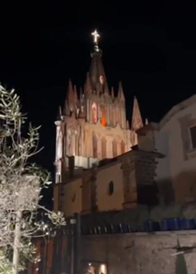 The video is a low-angle shot of a tall, gothic-style church at night. The church is brightly lit, highlighting its intricate architecture. A cross is perched on top of the highest spire. In the foreground, there's some sparse foliage that includes a small tree. A portion of a stone building is visible to the side of the church. The sky is dark and clear. The ambient sounds of music can be heard.