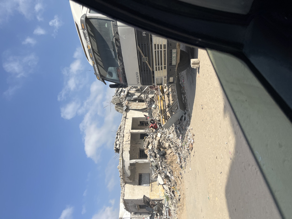 The image depicts a static street scene in Khan Yunis, Palestinian Territory, under a clear blue sky with scattered white clouds. The ground in the foreground and midground is unpaved, appearing to be dirt or sand. On the left side of the frame, a multi-story building is significantly damaged and partially collapsed, reduced to a large pile of rubble comprising concrete fragments, twisted metal, and other debris. The remaining structure of the building shows exposed rebar, partially intact window openings, and a section with two structural columns supporting an overhang. A small, red, possibly metallic object is visible within the central rubble pile. On the right side, the front section of a white Volvo FH semi-truck is parked. The truck's grille, headlights, front bumper, and windshield with a "Volvo" sun visor are visible. The license plate, "2-1039-16," with black characters on a yellow background, is affixed to the front bumper. A large, rectangular metal frame leans against the truck's front bumper and extends towards the rubble pile on the left. A light-colored, rectangular block rests on the ground directly in front of the truck. The photograph is taken from inside a vehicle, indicated by the dark frame and reflection of a car window in the lower right and foreground. No people or active interactions are visible in the scene.