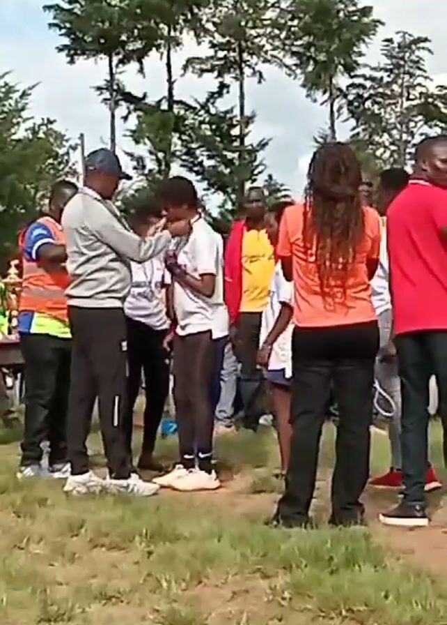 A group of people, mostly adults, stand in a grassy outdoor area, some wearing brightly colored shirts. One man in a grey jacket and baseball cap is placing a medal around the neck of a young person in a white shirt. There is a crowd of people seated in the background and tall trees behind them. A horn sound is audible.