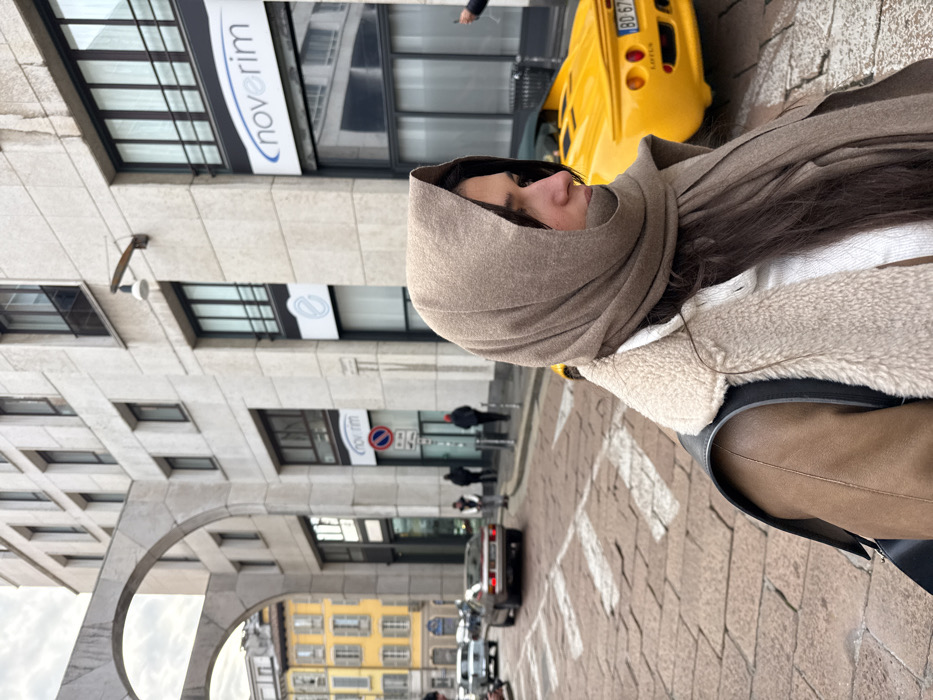 The image depicts an urban street scene on Via Monte di Pietà, Milan, Italy, under an overcast sky. In the foreground, the right profile of a female subject is visible, wearing a light brown headscarf, a white top, and a brown jacket with a prominent cream-colored sherpa lining. A black bag strap is present over her left shoulder, and her long dark hair extends beneath the scarf. Behind the subject, a yellow Lotus Esprit sports car is parked on the right side of the street, its rear section and Italian license plate visible. The street surface is composed of reddish-brown cobblestones with faded white chevron markings. On the left, a multi-story building constructed of light-colored stone features numerous windows and a large arched passageway. Signage for "noverim" is affixed to this building. Through the arched opening, a traditional multi-story building with a yellow facade is discernible. Several pedestrians are visible on the sidewalk in the midground, and other vehicles are present further down the cobblestone street.