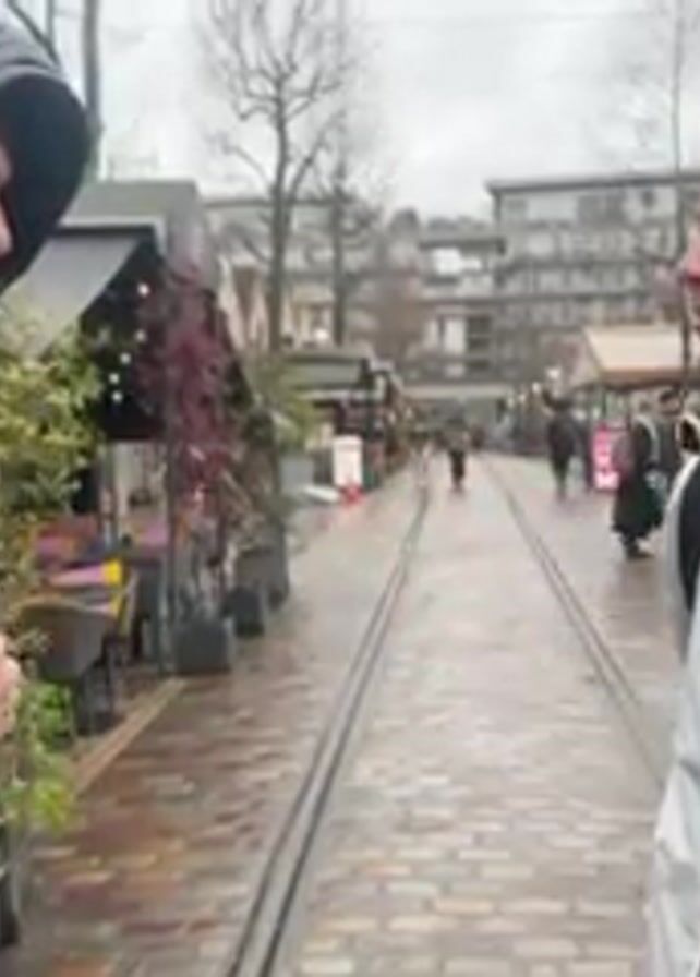 Two young men are standing on a wet, brick-paved path between what appear to be vendor stalls. The path has embedded train tracks. The man on the left is wearing a black puffer jacket with the hood up, and a backpack. The man on the right is wearing a white zip-up jacket with a hood and a backpack. They are facing each other, and they appear to be playing "Rock, Paper, Scissors." Other people are walking in the background. The setting appears to be an outdoor market or fair on a cloudy day.