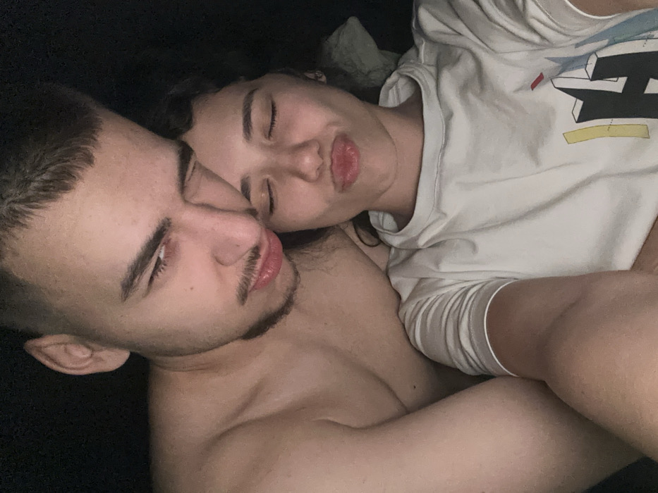 The image depicts two individuals in a close-up, low-light indoor setting. A male subject is positioned on the left, partially visible from the chest up, appearing to be shirtless. He has short dark hair, a mustache, and a goatee. His left eye is squinted or closed, while his right eye is open and directed towards the camera. His lips are slightly pouted. A female subject is positioned to his right, in the foreground, with her face and upper torso visible. She has dark, curly hair, closed eyes, and her lips are pursed in a pouting expression. She is wearing a light-colored (possibly white or light grey) crew-neck t-shirt with a partially visible graphic design featuring abstract, geometric shapes. The two subjects are in very close proximity, with the male's head resting near the female's. The background is dark and undifferentiated, providing no specific environmental details beyond suggesting an indoor space with dim illumination. There are no visual cues within the image to determine the specific location in the city of Sofia, Bulgaria.