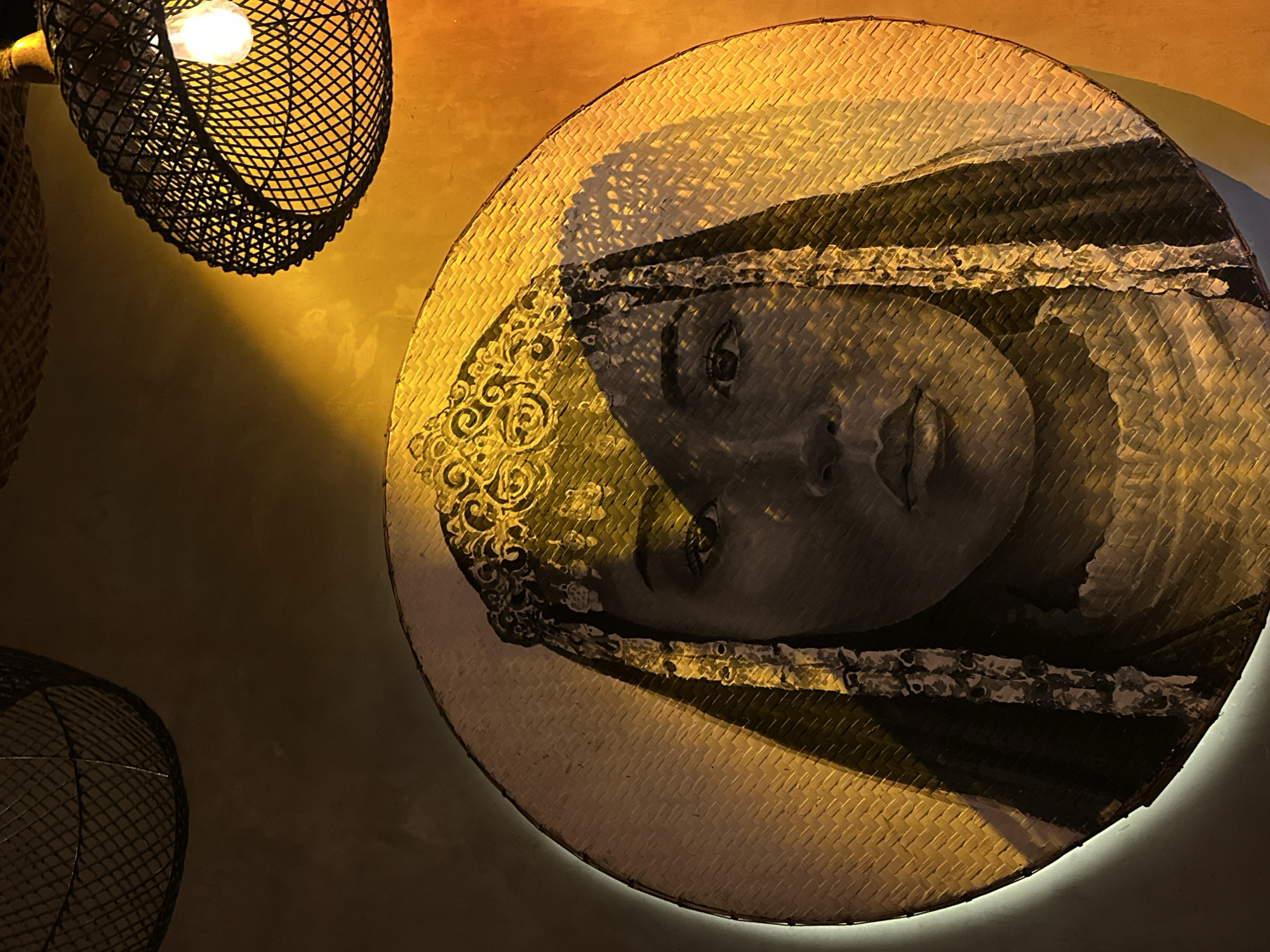 The image depicts a piece of art hanging on a wall. The art is a circular woven mat with a painting of a woman's face on it. The painting is in shades of gray and white. The woman is wearing an elaborate head covering with intricate designs. A light fixture hangs above the artwork. The light is casting a warm glow on the wall and the artwork. Another identical light fixture is visible at the bottom left, partially out of frame. The wall behind the artwork is a yellow and orange gradient. The location is Pererenan, Indonesia.