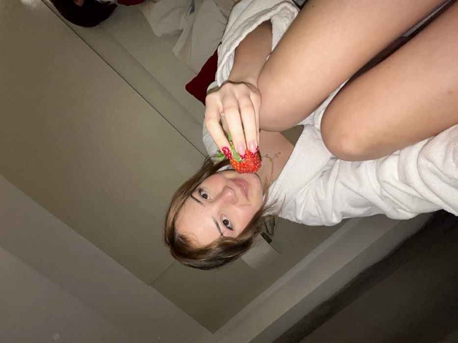 A woman in a white robe holds a strawberry near her mouth, looking at the camera. She is laying in bed with a red pillow and white sheets visible in the background. Her fingernails are decorated with a red and white pattern. A ceiling lamp is visible above her head, casting a warm glow on her face and shoulders. The picture is taken from an angled perspective.