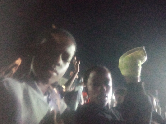 Two people are in the foreground, possibly a selfie. The person on the left is wearing a light-colored shirt. The person on the right is wearing a dark shirt and holding up what appears to be a green hat or object. Other people are visible in the background, seemingly attending an event or gathering, possibly at night given the poor lighting. The overall image is blurry and difficult to discern.